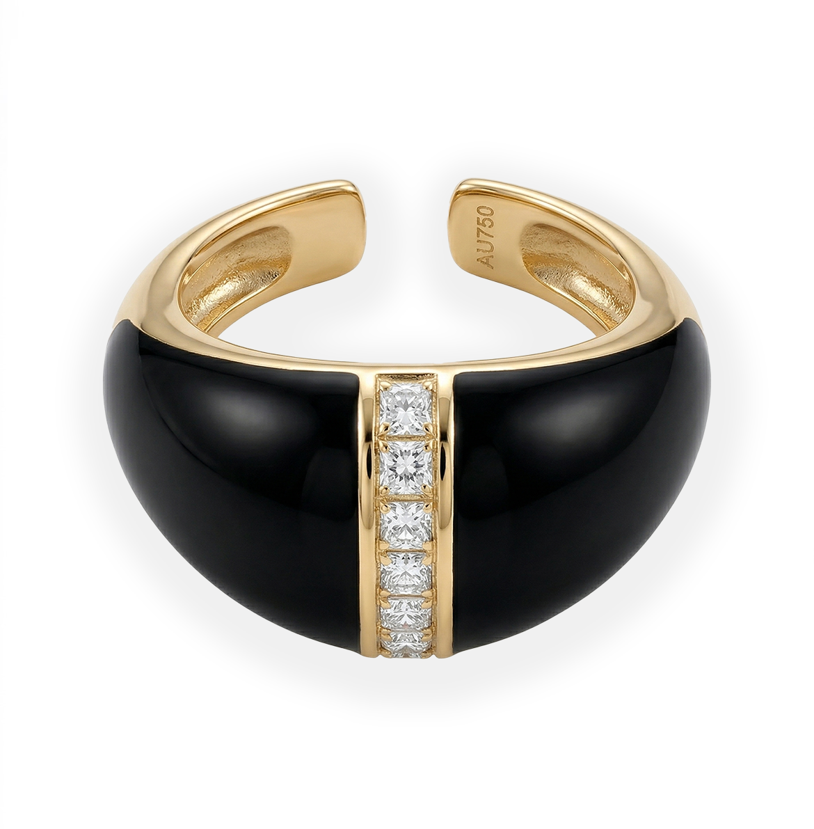 Anello Cabochon con Barretta Smalto Nero Zirconi Bianchi Rodio Giallo